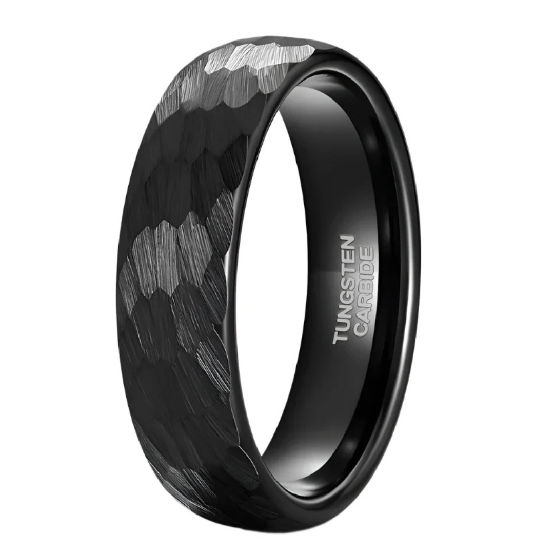 This hammered black tungsten carbide ring combines rugged texture with modern elegance. The distinctive hammer pattern adds depth and character, while the brushed matte finish gives the band a sleek, understated look that pairs effortlessly with any style.